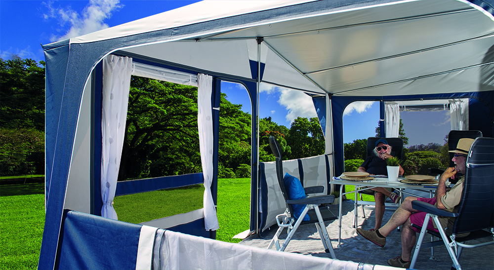 Toldo Caravan Instant Roof 300 con cerramiento para caravana, con estructura de aluminio y ventanas de PVC tintado.